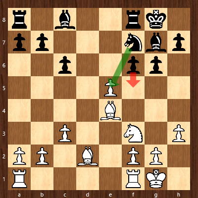 Nach 19. Sxe5 gewinnt man durch den Doppelangriff auf König und Läufer die Figur nur scheinbar zurück, denn nach Td8 verschwindet wiederum der weiße Springer auf d2 vom Spielfeld.