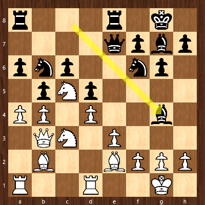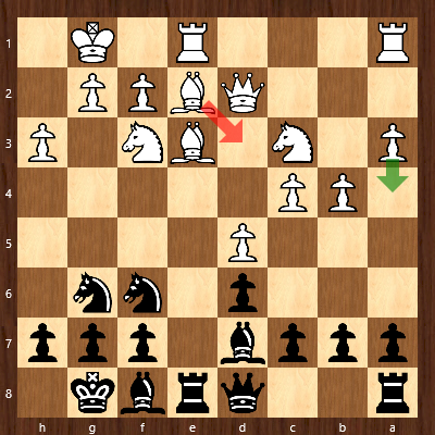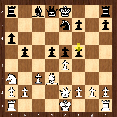 Nach 12… e4 13.fxe4 hätte 13. …Sxd5 Vorteil für schwarz bedeutet. Stattdessen wählte Johannes 13. …Sxe4, der nach 14. Dxg7 zu einem Mehrbauern für Weiß führt.