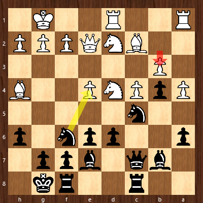Mit 13. Lc2 oder dem gleichwertigen 13. Dh4 hätte Weiß Schwächen in der schwarzen Königsstellung provozieren können. Nach 13. f4 haben die weißen Figuren aber nach 13…g6 keine Möglichkeit mehr, über die schwarzen Felder anzugreifen.