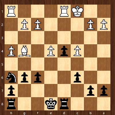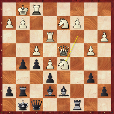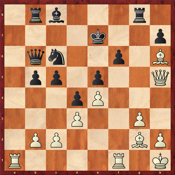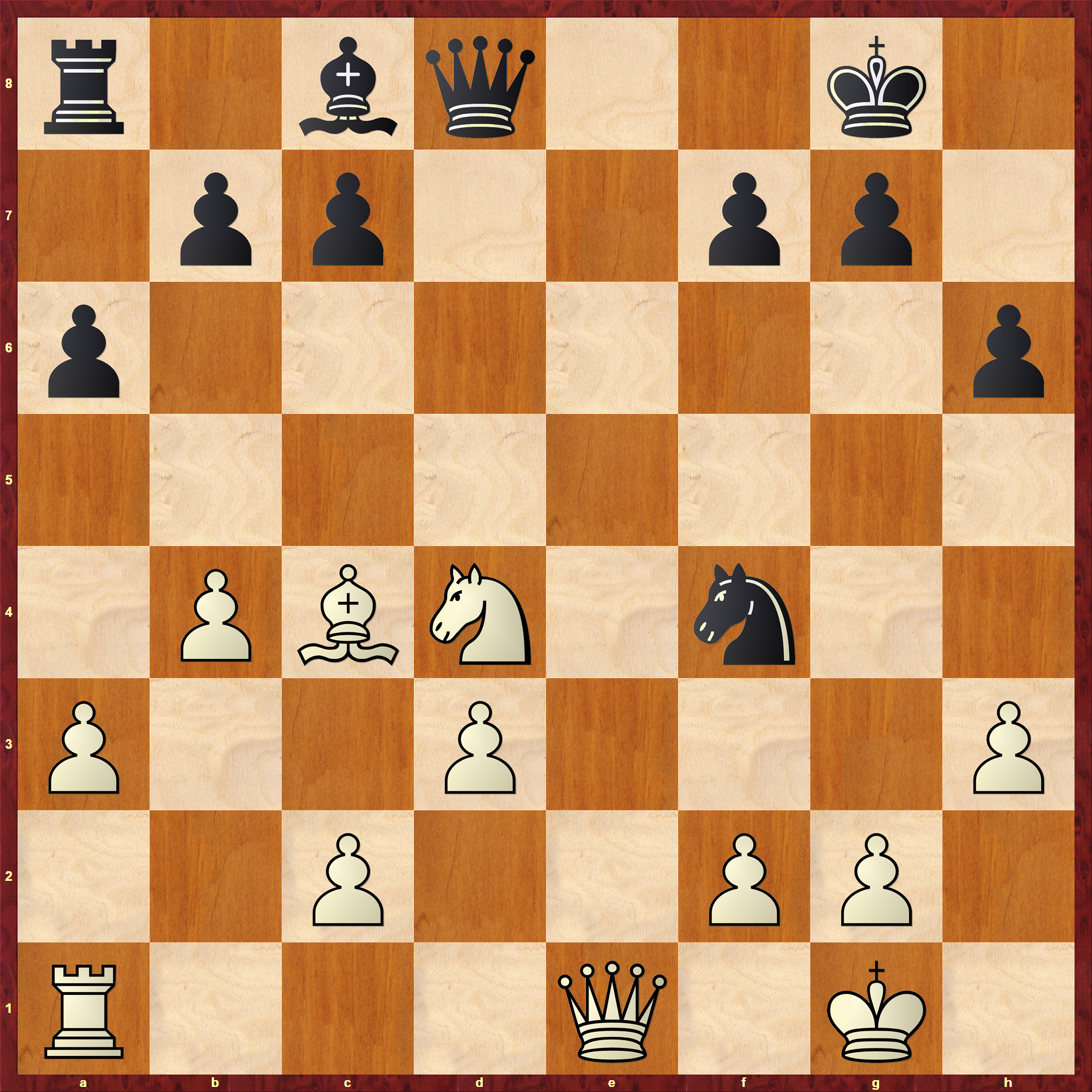 Christian bereitete stattdessen mittels 16…Te6 die Verstärkung des Drucks vor und behielt alles unter Kontrolle. Die offene König und die abseits stehende weiße Dame sollten ihm weitere taktische Möglichkeiten geben. Sich scheinbar keiner Gefahr bewusst, öffnete der Neumarkter mit 17.g4?? und 18.g5?? weiter seinen Königsflügel, doch Christian packte die Gelegenheit immer noch nicht beim Schopfe. Wenige Züge später hatte er schließlich die letzte Chance seine ausgezeichnete Partieanlage in einen fulminanten Angriffssieg umzuwandeln: