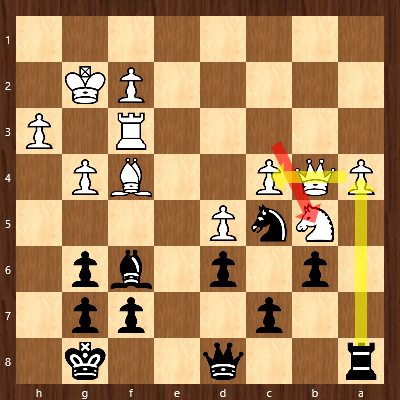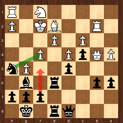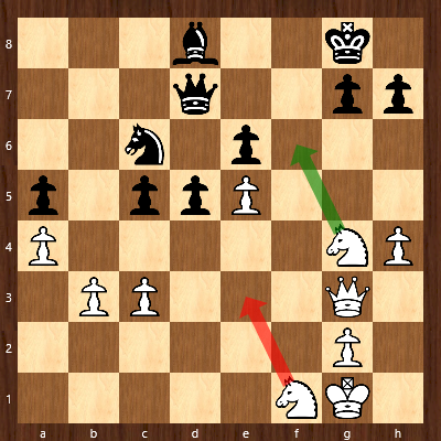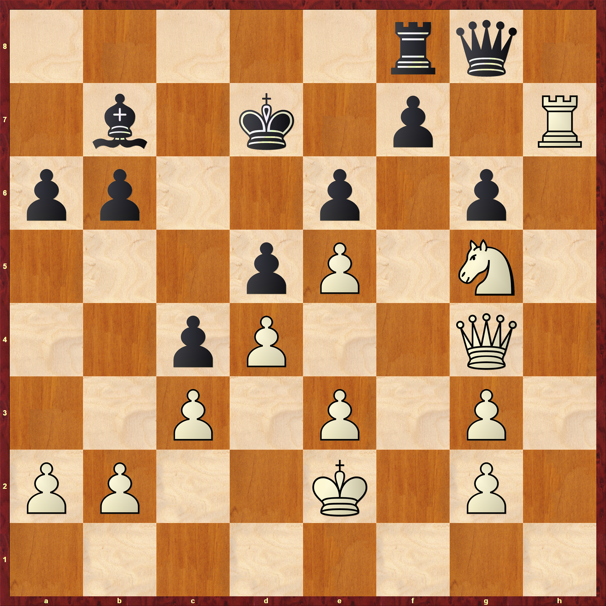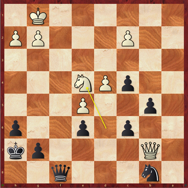 Nach 31. Se4 hätte 31. …Df4! gewinnbringenden Vorteil versprochen, da die Dame Zugang zu den wichtigen Feldern e1 und d4 bekommt, sodass der weiße König in Bedrängnis kommt. Eine letzte Ausflucht wäre 32. Sf3+ Kg6 33. Dxg7! Kxg7 34. Sh5+ mit Gabel auf Dame und König gewesen, aber auch hier hätte Schwarz durch den aktiveren König ein besseres Endspiel.