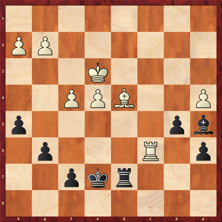 Hier ließe sich mit 33. …Ld2+ 34. Kd3 (34. Kxd2 ist wegen 34. …Txd4+ und anschliendem Txa4 schlechter) 34. …Lxf4 (droht Le5) 35. Kc3 Tc7 in ein gleichfarbiges Läuferendspiel mit einem Mehrbauer abwickeln. Schwarz zog aber 33. …bxa4 und musste nach dem Zwischschach 34. Lf6+ in ein Turmendspiel mit Minusbauer.