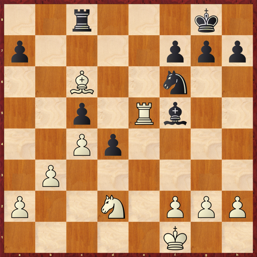 Der Computer wähnt hier Weiß nach 25. Lb7 Ld3+ 26. Ke1 Tc7 27. Le4 Lxe4 28. Sxe4 Sd7 (nicht Sxe4 wegen Te8#) 29. Te8+ Sf8 stellungsmäßig im Vorteil. Svatoslav zog 25. Txf5 Txc6 26. Te5 und beide Seiten waren bei ausgeglichener Stellung mit einem Remis zufrieden.