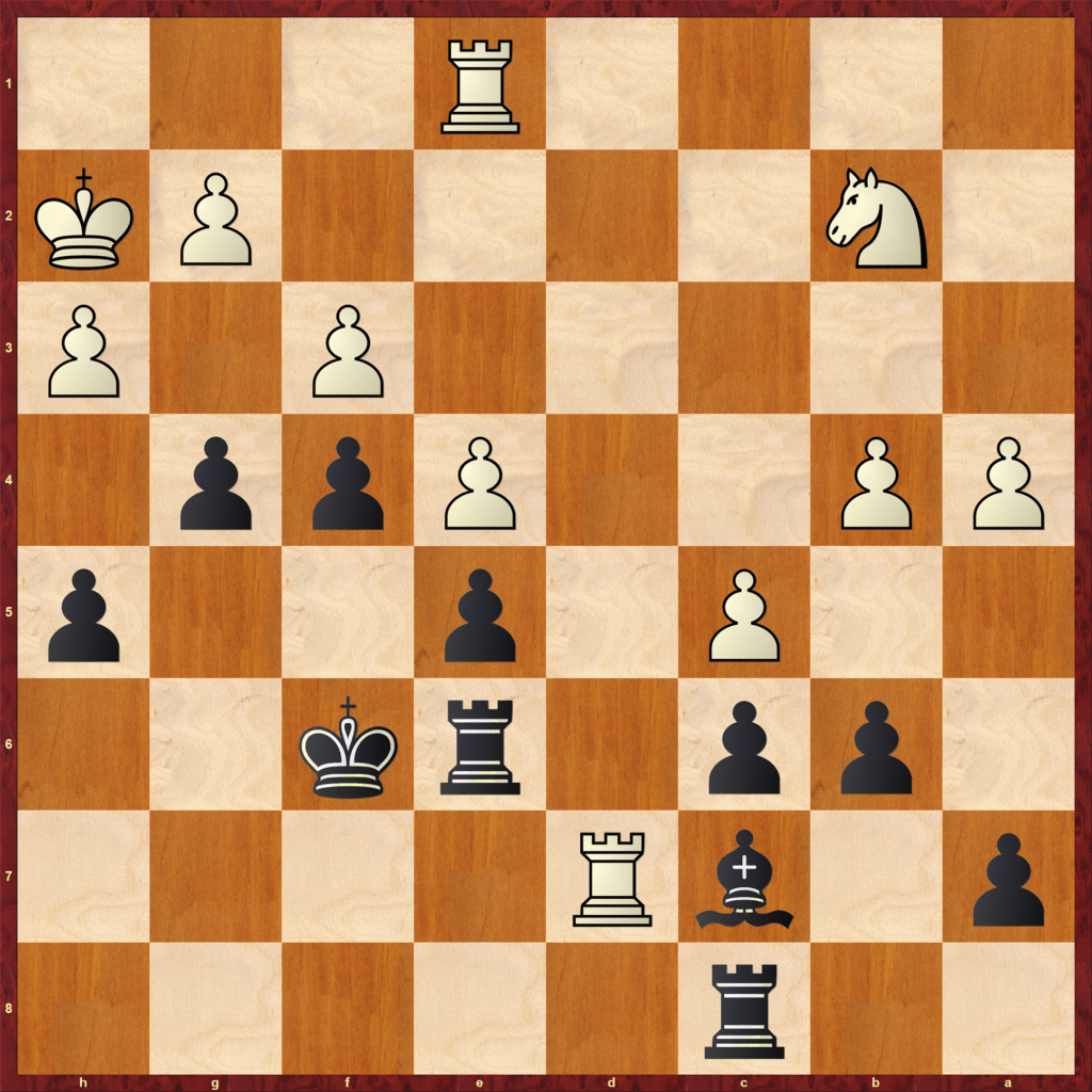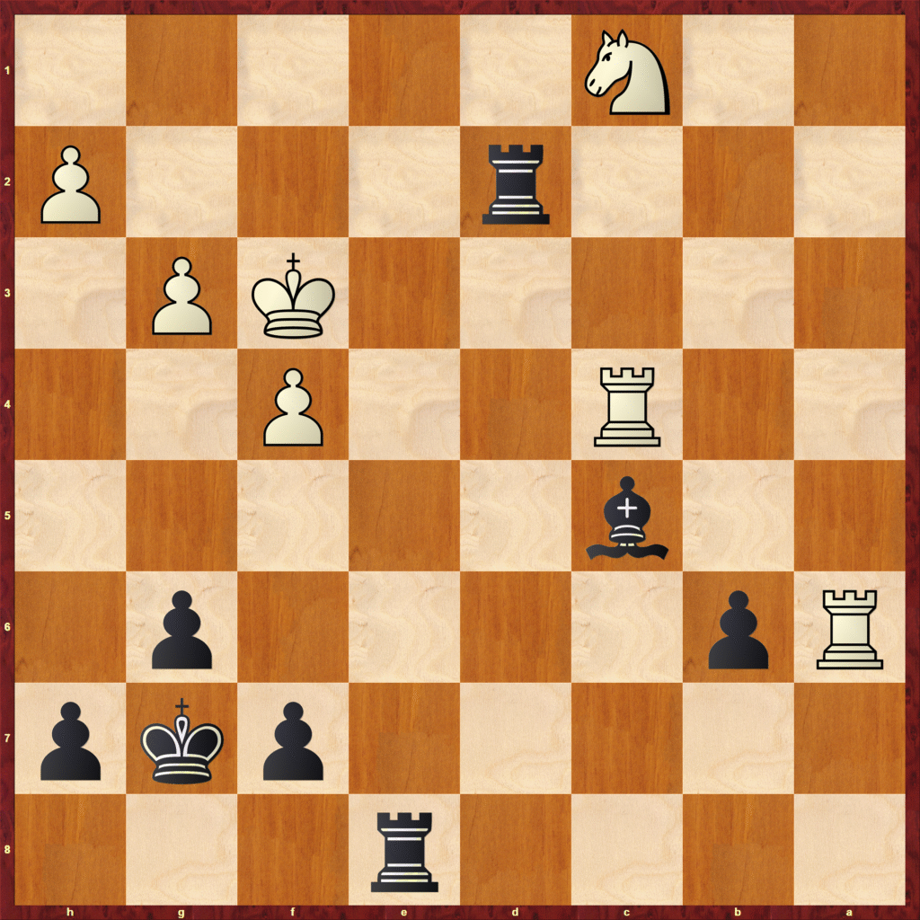 Brett 6: Weiß hatte gute Chancen auf ein Remis als er in dieser Stellung 50.Td6+?? wählte. Nach 50…Ke7 hing nicht nur sein Turm, sondern auch sein Springer auf d3 wegen eines potentiellen Turmspießes auf der dritten Reihe!
