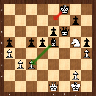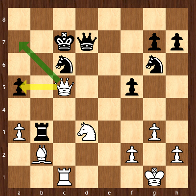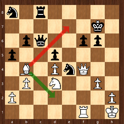 Nach 20. Sxc4 nahm der Schwarze das Opfer fälschlicherweise an. Die weiße Dame gelangte als Folge nach f7 und gewann mit dem Läufer auf f8 die Figur zurück.