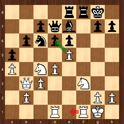 Nach 16… Sc6 hätte Weiß mit Kh1 in leicht schlechterer Stellung im Spiel bleiben können. Stattdessen kam 17. Lxf6 und der Weidener gab im Anschluss die Dame für Läufer und Turm.
