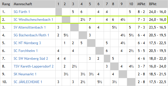 Am sechsten Brett hatten sich zwei Schnellspieler mit unkonventionellem Stil gefunden. Schon nach dem dritten Zug von Weiß war eine Stellung auf dem Brett, die selbst in einer Datenbank mit Millionen von Partien noch nicht vorgekommen ist (1.e3 g6 2.d3 Lg7 3. a3). Florian Süß mit den schwarzen Steinen konnte im weiteren Verlauf taktisch einen Bauern gewinnen. Während man sich an den anderen Brettern noch Gedanken um die Eröffnung oder einen Übergang ins Mittelspiel machte, war an diesem Brett schon ein Turmendspiel entstanden. Florian hielt seinen Mehrbauern fest, drang schließlich auch noch mit seinem König in die gegnerische Stellung ein und stellte somit den Sieg für sich und den Ausgleich für die Mannschaft her.