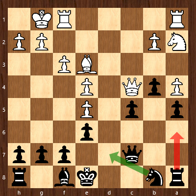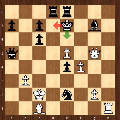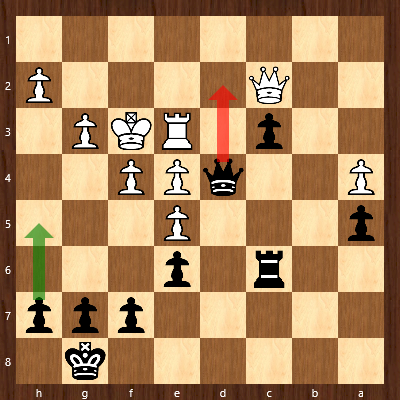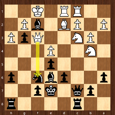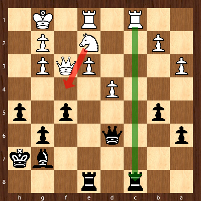 In weiterhin angespannter Lage versuchte Caro mittels Verdoppelung der Türme auf der g-Linie den weißen König zu attackieren, wählte dabei aber eine unglückliche Zugfolge, die sie in erhebliche Schwierigkeiten hätte bringen können: