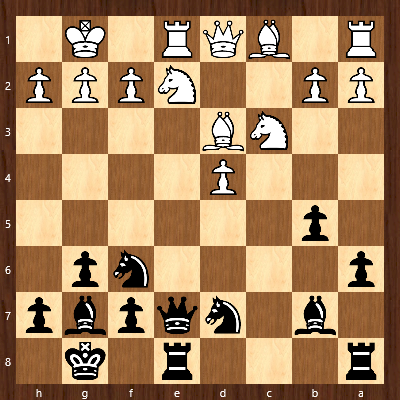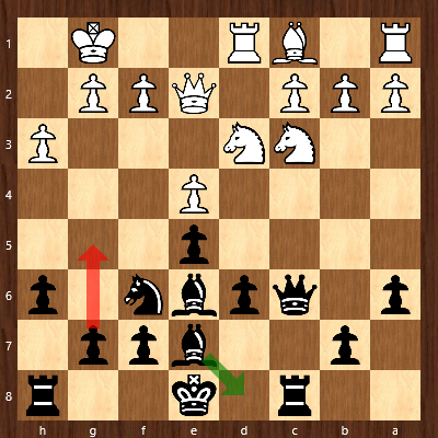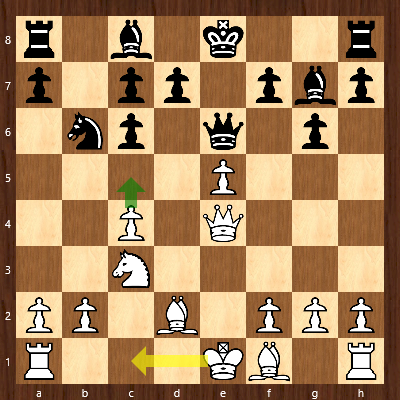 Aufgrund der unglücklichen Positionierung seiner Dame sah sich der Karether gezwungen lang zu rochieren, womit er die Lage auf dem Brett weiter verschärfte. Einen Zug später hätte ihn ein Fehler bereits Kopf und Kragen kosten können: