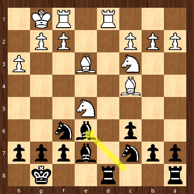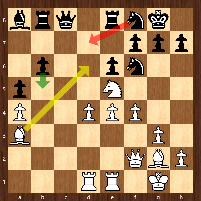 Während Weiß für sein Läuferpaar die Stellung öffnen kann, ist der schwarze Läufer hinter seinen Bauern eingesperrt und auch der König wird in Kürze Probleme bekommen.
