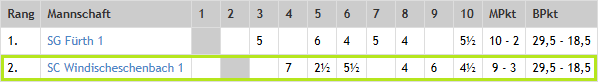 An Brett 6 (W) bediente sich Carolin Werner gegen die Skandinavische Verteidigung einer seltener gespielten Variante und fianchettierte ihren Königsläufer. Die Eröffnung verlief in ausgesprochen ruhigen Bahnen und brachte der Windischeschenbacherin außer dem Läuferpaar keinen nennenswerten Vorteil. Der anschließende optimistische Vorstoß des g-Bauern hätte daran eigentlich nichts ändern sollen, doch ihr Gegner überreagierte ebenso ein wenig und fand sich ohne Vorposten für seine Springer in einer zwar festen aber unbequemen Stellung wieder. In die Passivität gezwungen beging der Nürnberger mehrere Fehler, die zum Zusammenbruch seiner Verteidigung hätten führen können, doch leider verpasste Caro diese Gelegenheit, wonach sich das Blatt hätte wenden können. Doch da an diesem Tag so gar nichts zusammenlaufen wollte für die Gäste, revanchierte sich der Nachziehende postwendend und stand erneut glatt auf Verlust. Mit zwei Mehrbauern und besserer Königsstellung sah der Rest nach Routine aus, doch eine Schrecksekunde musste noch überstanden werden. Nach einem schrecklichen Überseher hätte der Nürnberger mittels eines Turmopfers mit anschließendem Dauerschach Caro den verdienten Sieg doch noch entreißen können, doch auch diesmal ging er an seinem Glück vorbei. Eine dritte Chance sollte er nicht bekommen und so musste er sich wenige Züge später in Anbetracht weiteren Materialverlusts endgültig geschlagen geben. (5½-½)